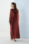 Embrace understated luxury with this burnt henna 2-piece pret in sumptuous silk. The long shirt showcases a boat neck with front loop button detailing, embroidered scalloped side slits and hem, and elegantly fitted sleeves with scalloped edges. Paired with wide-leg trousers featuring embroidered hems, this ensemble radiates graceful sophistication perfect for festive or evening occasions.