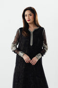 Elevate your wardrobe with this stunning 2-piece pret in timeless black. Crafted in luxurious georget chiffon, the long shirt features a round embroidered neckline with a front slit, all-over hand-printed lining, and delicately embroidered borders. Fitted embroidered sleeves add a touch of elegance, while the georget chiffon sharara with hand-printed lining completes this effortlessly graceful ensemble perfect for festive and evening occasions.