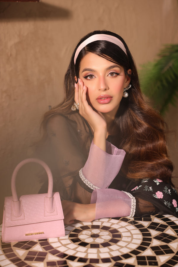 An elegant black self-embroidered organza sequined shirt, paired with screen-printed culotte pants for a super cute look. The outfit is completed with a beautiful organza dupatta finished with a screen-printed border on all four sides.