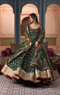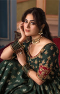 Soreya brings back emerald green with a bang in this stunning zari karandi ensemble. This kalidaar not only promises unrestricted movement but also features a silhouette designed to flatter. The bodice and sleeves come alive with meticulously hand-embellished dabka and silk threadwork, showcasing a vibrant palette of colors. The stylized back, adorned with intricate details and delicate hangings, adds a touch of enchantment to the ensemble. Completing the look is an organza dupatta, adorned with hand block printing and finished with kinari-trimmed borders, enhancing its elegance..