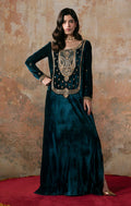 The rich deep teal blue kaftan shirt simply radiates glamour. Cut from plush velvet and with intricately hand embellished techniques using dabka and kora along the neckline and stunning hand embellished sleeves. Floor length with an uber flattering neckline the NAME Kaftan will make you look gorgeously put together with minimal effort. embellished pants.Â