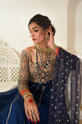 A navy peony silhouette , lavishly adorned with intricate embellishment on the front and back bodice , creates an alluring look. The opulent peshwas showcase heavy embellished borders , evoking a regal charm fit for royalty. Completing this enchanting ensemble with digital printed florals on pishwas. It has four sided embellished borders dupatta exudes an aura of ethereal elegance.