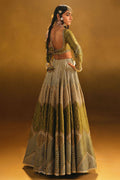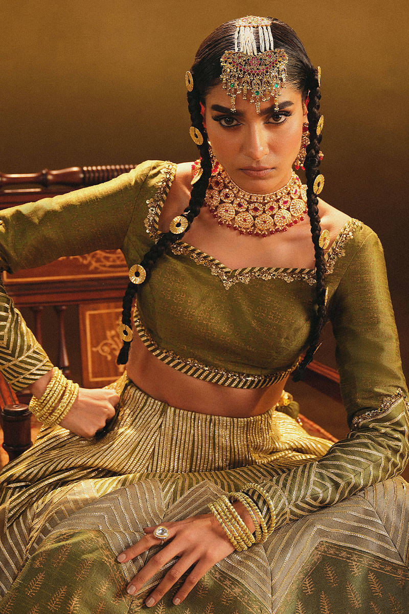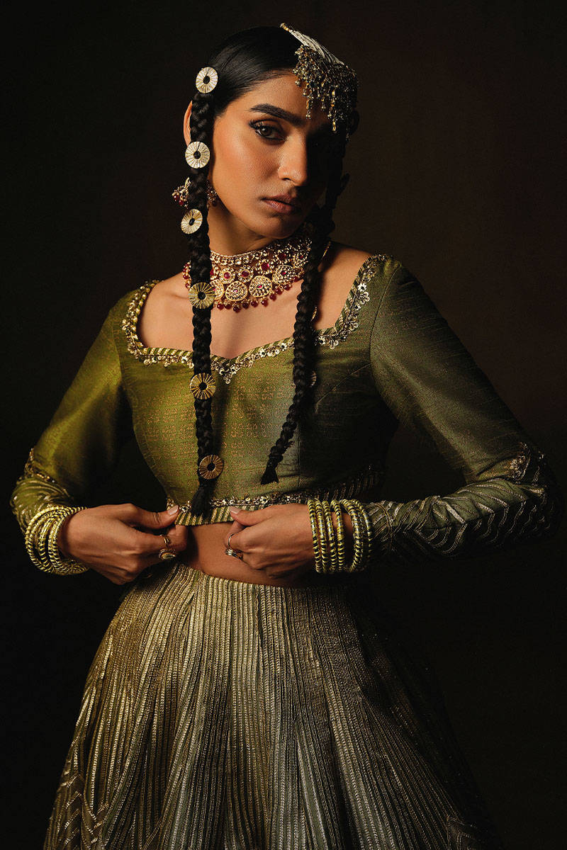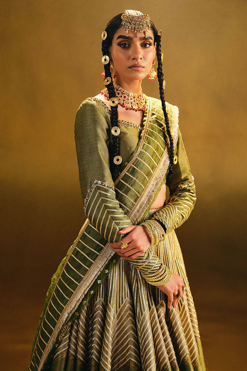 Embrace the natural allure of the Amaltas ensemble, featuring a zaitoon green Indian silk lehenga adorned with khaki appliques. The Indian silk choli boasts block and adda work, complementing the Sitari organza dupatta with Indian silk goti and intricate trims. Traditionally used to adorn royal attire, Gota patti is here reimagined to grace this ensemble with cultural richness.