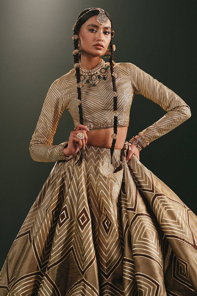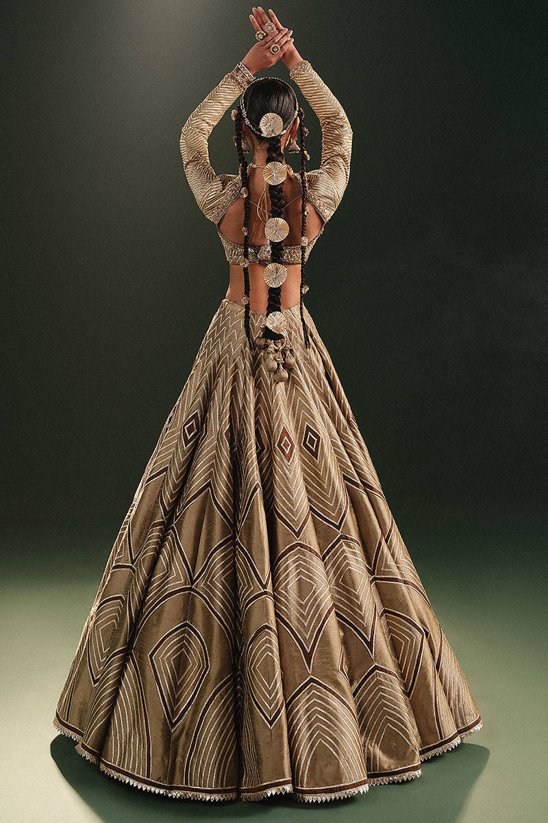 Embrace warmth and richness in the Inzar ensemble, showcasing a petal brown Indian silk lehenga adorned with dark brown appliques and intricate goti kinari. The Indian silk choli boasts goti and adda work, harmonizing seamlessly with the organza dupatta featuring block print and enhanced trims. The earthy tones create a captivating canvas, reflecting the beauty of nature's hues.