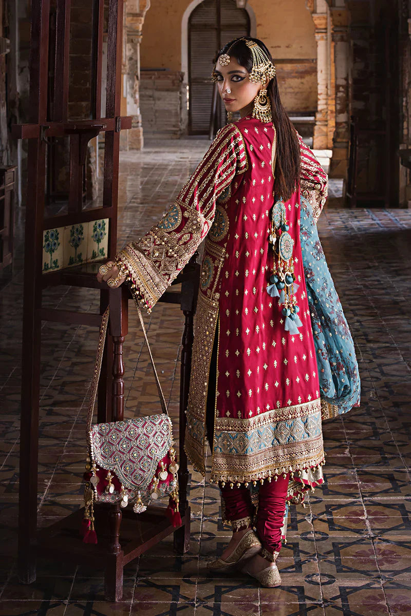 Introducing the 'Bibi Lal' ensemble, a breathtaking masterpiece that combines the regality of a red silk shirt with the serenity of a turquoise blue organza dupatta. The silk shirt is a canvas of intricate craftsmanship, adorned with card mirror, pearls, Tilla work, precious jewels, and ada-work. The satin silk contrast border and side circles patches lend a touch of opulence to the ensemble.Completing this enchanting composition is an organza printed and embroidered dupatta with a four-sided satin silk border, adding a harmonious contrast to the vibrant red. The silk embroidered trouser enhances the allure of 'Bibi Lal' with its rich detailing. This ensemble is a true embodiment of bridal elegance, where tradition meets contemporary splendor
