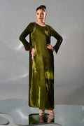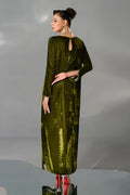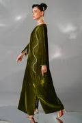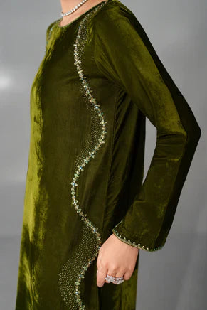 This elegant ensemble is crafted in luxurious velvet, featuring intricate adda work on the shirt and sleeves for a timeless, refined look. Designed with a stylish neckline accented by a back keyhole, the silhouette offers a graceful balance of modern and classic detailing. The shirt is tailored with a mid seam and enhanced by delicate slits, creating effortless movement and sophistication. Paired with a straight trouser in premium raw silk, this outfit exudes understated luxury, making it a perfect choice for formal gatherings and evening occasions.