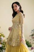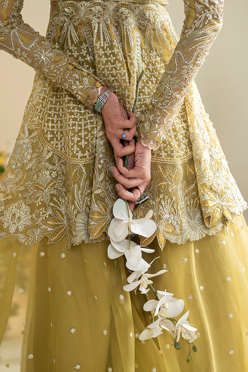 Shams from Vasl '24 emerge as a radiant symphony of luxury, casting a golden aura. The ethereal ensemble showcases an exquisite combination of an organza shirt and sharara, adorned with intricate silver moti work and meticulous embroidery. The embellishments include luminous pearls, intricate dabka, sparkling stones, and ornate tilla, creating a harmonious blend that epitomizes grandeur. Enhanced with an organza dupatta, this ensemble becomes a true celebration of refined style, offering a regal and majestic presence for your most special occasions.
