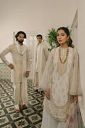 This short self-patterned cotton net kurta in Moon White has subtle embroidery around the button placket in tonal anchor and Resham work. The neckline and sleeve borders feature fine detailing, making it an airy, effortless choice. Designed for Eid days spent moving from home to home, embracing tradition with a look that feels light yet refined.
