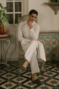 A short cotton kurta, loose trousers, and waistcoat set in seashell white, featuring Mughal-inspired tone-on-tone embroidery. The collar and sleeves have fine border embroidery, while the waistcoat carries repeat motifs in tonal anchor and Resham thread for a refined finish. Perfect for leading Eid prayers or welcoming guests at home, embodying the spirit of the day in timeless white.