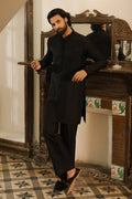 A short self-cotton kurta and trousers in Midnight Black with tonal black anchor and Resham embroidery across the chest. The loop-button band collar neckline and embroidered sleeve borders offer a structured, modern finish. An ideal pick for Eid evenings whether stepping out for a festive dinner or enjoying the night breeze on a rooftop gathering.