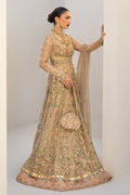 Elegance blooms in €˜Coras - a masterpiece draped in a soft beige canvas adorned with meticulous handcrafted details. Dabka, aari work, hand-cut Sitara, and zardozi unite to create a truly magnificent look. Paired with raw silk trousers and an exquisite net dupatta, this ensemble redefines chic and regal style for the season. Couture at its finest.