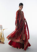 Designed as a kalidar , this gorgeous red organza 6 panel peshwas offers a perfect modern touch to the classic cut.Floral vines climb up the stylishly composed panels and are delicately hand embellished with finesse using nakshi , dabka, pearls and glistening crystals .Paired with an organza embroidered and sequin embellished heavy dupatta to complete the formal festive look.
