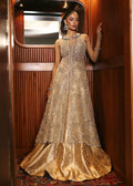 A stylish gold gown featuring signature SFK floral Embrodiery jaal and detailing. Offset by a gorgeous kick of emerald green stone and sparkling crystal embellishment all over the gown. This formal look is styled with a brocade lehnga and a gorgeous fine net gold dupatta that has scalloped handworked edging all around.