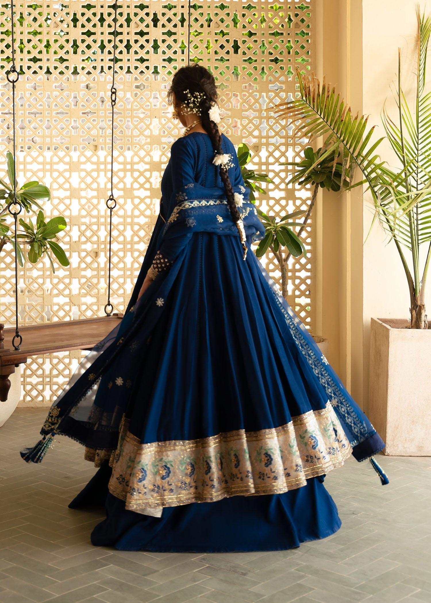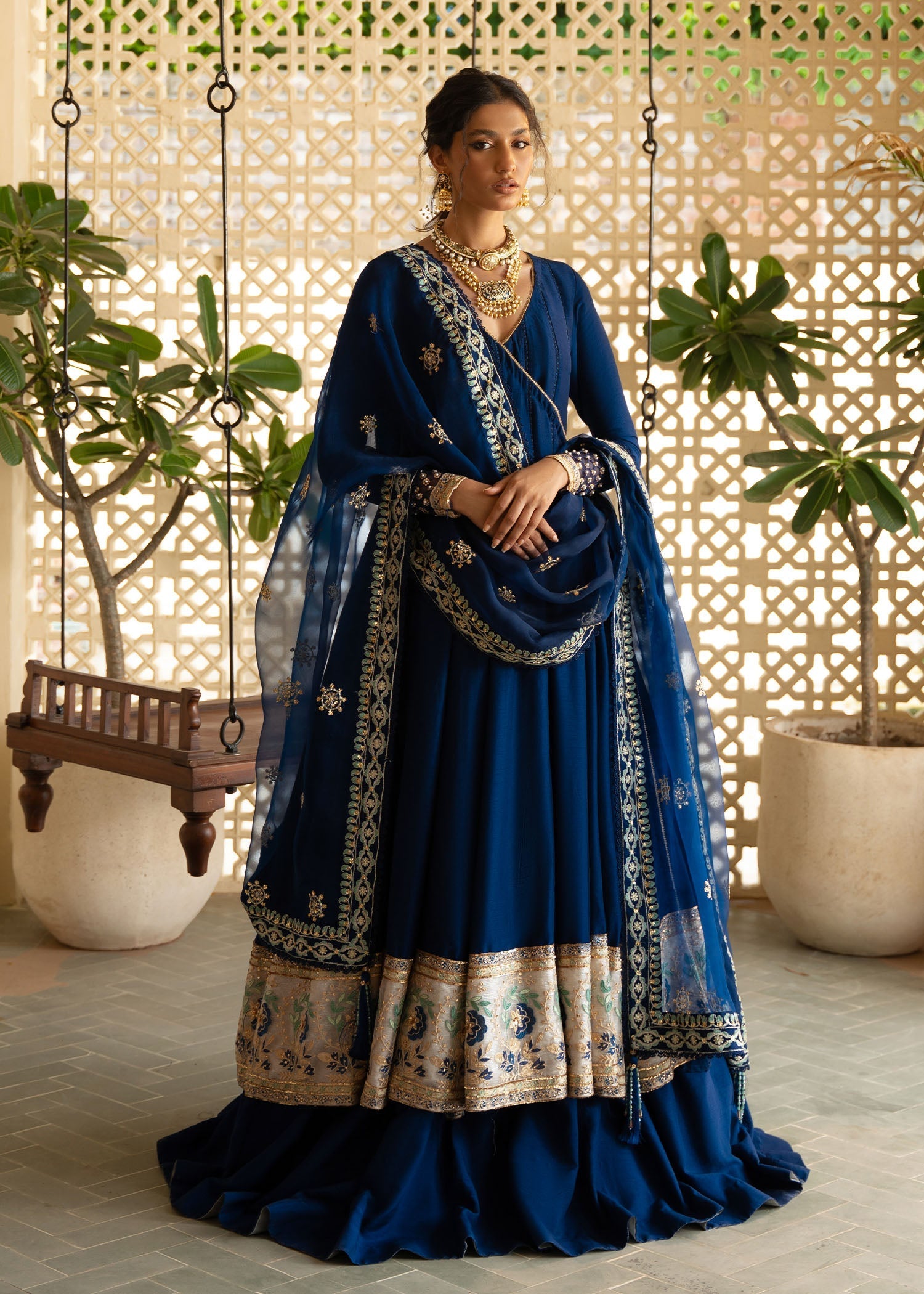 Royal blue classic peshwas sown painstakingly with fine jaali lace inserts and finished with a heavy embroidered floral border thatÂÂs enhanced with gold sequin work. The peshwas is paired with a sharara and an embroidered organza dupatta to complete the look.