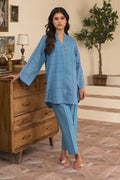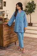 Update Your Daily Essentials With Our Blue Co-Ord Set, Featuring A Jacquard Shirt With A Pleated Front And Wooden Buttons Paired With Straight-Cut Trousers.