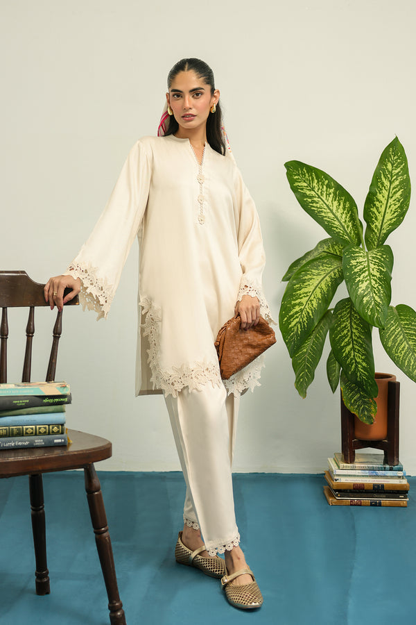 This elegant outfit features a straight-cut shirt with a rounded lace border and floral appliqué neckline for a refined, handcrafted touch. The long sleeves with matching lace add balance and cohesiveness. Paired with it is a classic shalwar with a slightly tapered cut, featuring lace trim at the hem for an elegant finish.