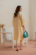 Radiate elegance in this long yellow shirt featuring delicate floral embroidery on the daman and unique overlap-cut sleeves shaped like petals. Paired with sleek straight pants for a graceful finish.