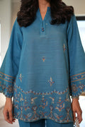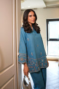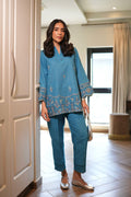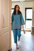 A serene blue co-ord set featuring delicate tonal embroidery inspired by traditional floral vines. The shirt showcases intricate thread work along the sleeves and hemline, adding a touch of sophistication. Tailored straight pants complement the ensemble with a refined, modern edge.