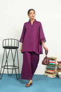 This sophisticated two-piece co-ord set is presented in a rich, solid plum color. The ensemble features a relaxed, tunic-style top with a V-neck and a structured collar, paired with matching loose straight-fit trousers. The defining and most striking feature of the outfit is the meticulous thick lace border on tunicÂÂs three-quarter sleeves, and trousers hem. Overall look is effortlessly polished and modern.