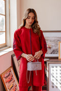 The straight-cut red colour kurta features delicate navy blue embroidery along the front placket and sleeve edges, adding a touch of contrast and sophistication. Paired with cropped straight pants for a sleek silhouette.