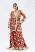In rich tones of burnt orange and earthy hues, this ensemble combines tradition with contemporary ease. The sheer organza jacket, patterned with painterly florals, is edged with intricate gota and mirror embroidery that frames the neckline, cuffs and borders. It is paired with a fully embellished printed khaddi silk tube top, while a khaddi silk dhaka pajama carries the same botanical print, its borders richly adorned with embellishment for an effortless yet resplendent finish.