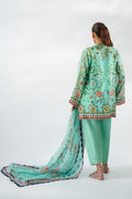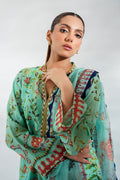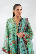 A poetic ode to craft, this three piece ensemble unfolds on a serene seafoam canvas, adorned with painterly florals and timeless zardoze embroidery. The short cotton net kurta, cut in a relaxed silhouette, is rendered with botanical motifs elevated by resplendent threadwork and framed with ornamental borders in saffron, amber and indigo. Gilded detailing at the neckline lends a subtle radiance. It is paired with a tapered pure rawsilk shalwar touched with delicate embroidery, and a sheer organza dupatta scattered with painterly florals and edged in scalloped finesse.