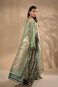 Unfolding on a seafoam and ivory canvas, this flowing silhouette carries the poetry of painterly craft. The front open cotton net shirt is adorned with botanical vignettes in jade, indigo and amber, framed with ornamental borders that cascade along its length. Intricate embroidery blooms across the surface, while contrasting hems finish the sleeves with finesse. Paired with ivory and indigo printed box pants cut from crepe and a matching crepe tube top.