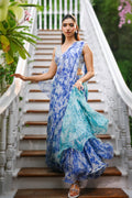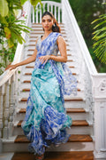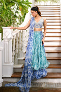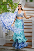 Awash in tones of azure, this ensemble evokes the freshness of summer skies and sea. The khaddi silk blouse, cut with a sharp V neckline, shimmers with silver gota and bead embroidery, adding a touch of brilliance. A layered chiffon lehenga blooms with teal and azure florals, lightly dusted with sequins for a glimmering effect. A diaphanous chiffon dupatta in matching tones, printed with delicate florals, drapes effortlessly to complete the look.