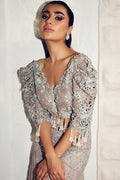 An ethereal saree in muted lilac, draped in diaphanous French tulle, dusted with sequins and tonal embroidery, and finished with pearl tassels. The sculpted tissue blouse stuns with opulent cutwork, zardoze embellishment, and dramatic puffed sleeves that cascade into a fringe of beaded drops. Paired with a pre-draped French tulle dupatta gathered on one shoulder and edged with bead tassels, the ensemble whispers haute couture elegance with a modern, sculptural edge.