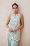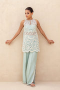 In soft aquamarine, this sleeveless top is overlaid with ivory floral vines and scalloped motifs embroidered across sheer tulle, drifting like lace. The hem falls in delicate scallops, tracing the silhouette with lightness and grace. Paired with wide raw silk trousers, framed with embroidered edges and side slits, the look carries a quiet poise that feels like a breath of ocean mist translated into couture.