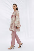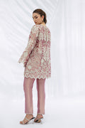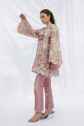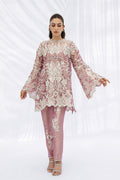 A mauve toned tissue tunic, cut in a relaxed A-line silhouette, is adorned with ivory florals, trailing vines, and eyelet detailing, finished with scalloped edges and applique accents. The embroidered round neckline and bell sleeves with scalloped hems lend a touch of graceful refinement. Paired with slim tissue trousers in a matching mauve, delicately embroidered with resham florals and eyelet motifs, the look carries subtle dimension.