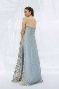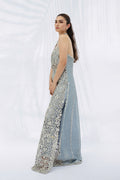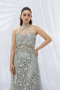 A vision in glacial silver, this halter dress is sculpted from intricate cutwork, glimmering with crystals and tonal zardoze embroidery. The diamante-encrusted crisscross neckline lends architectural drama, while a sheer overlay reveals a sleek bandeau beneath. Paired with pure raw silk trousers, the look becomes a statement of modern artistry.