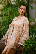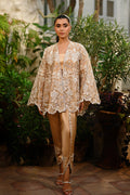 A whisper of gold, this ensemble pairs an opulent tissue jacket with charmeuse silk separates. The jacket blooms with intricate ivory threadwork, applique details, and cutwork florals, scalloped along the hem and flared sleeves for dramatic grace. A sleek charmeuse tube top anchors the look, while a tapered tulip shalwar in charmeuse is adorned with floral embellishment, scalloped edges, and tonal applique embroidery trailing the seams for a soft, elegant finish.