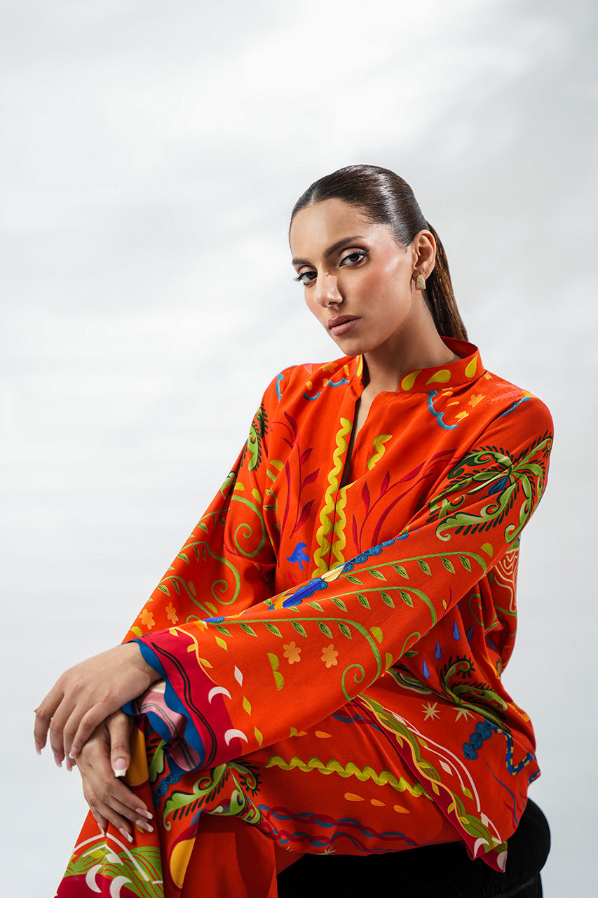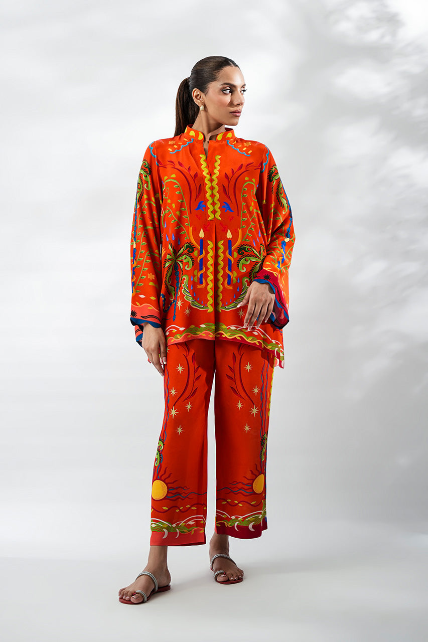 A striking crepe ensemble that radiates bold elegance. The relaxed top features a vivid print inspired by tropical and celestial motifs, brought to life in a vibrant palette of tangerine, cobalt, lime, and gold. The design continues seamlessly into coordinated culottes, where sun and palm motifs accent the hems. Finished with a sleek band collar and scalloped sleeves, the look embodies modern ease.