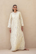 Rendered in timeless eggshell khaddi corduroy, this kaftan embodies understated grandeur through intricate craftsmanship. The graceful silhouette is adorned with dense tonal aari embroidery, featuring accents of gold zardoze that flow seamlessly across the surface. A striking keyhole neckline adds modern refinement, while the straight cut and full sleeves allow the richly textured needlework to take center stage.