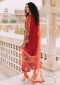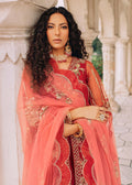 Description: Jaan-e-Jahan; our €˜Nawab Jaans is the showstopper for the season. Her ambitions are full of passion and she likes to be by herself, involved in poetry and calligraphy. Her ensemble is her identity. The ruby red soft bareeze net shirt duppata has floral embroideries with a jaal pattern running in between. The same gold tilla embroideries are continued to the raw silk trouser. Naqshi, dabka, sitara and crystal hand applied embellishments enhance the resham embroideries to exude a magnitude of char