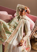 Absolutely stunning, Daalia is made on delicate chiffon in cool mint green. Highly intricate gold tilla embroideries are made more beautiful with soft pink and green resham. Shimmering pearl and sparkling sitara embellishments are hand applied for a timeless feel. An embroidered chiffon dupatta with a block printed spray and silk trousers give an elegant yet modern style to this ensemble