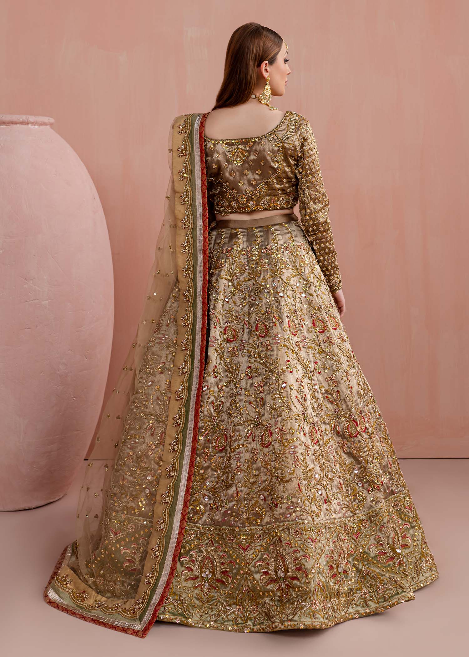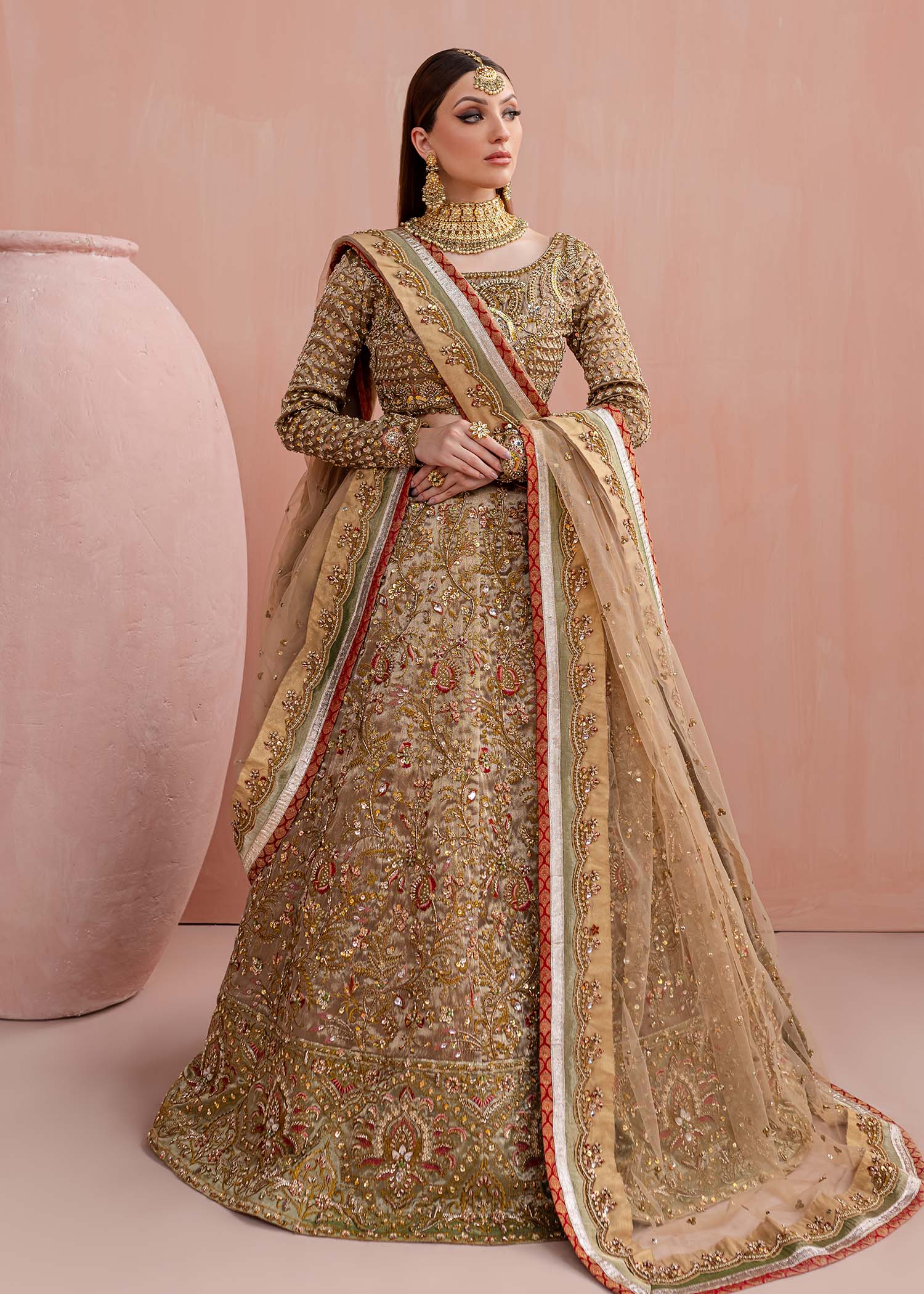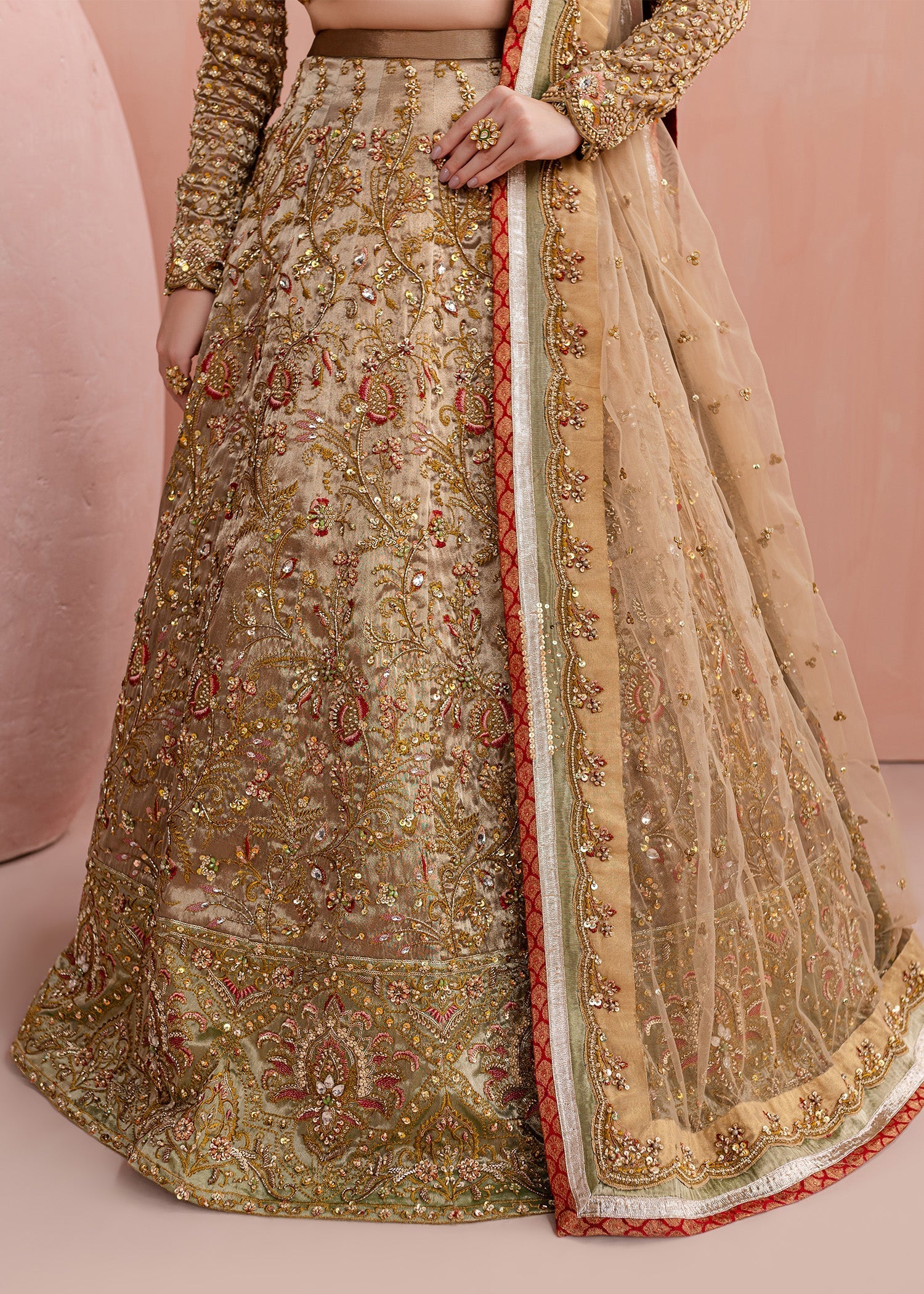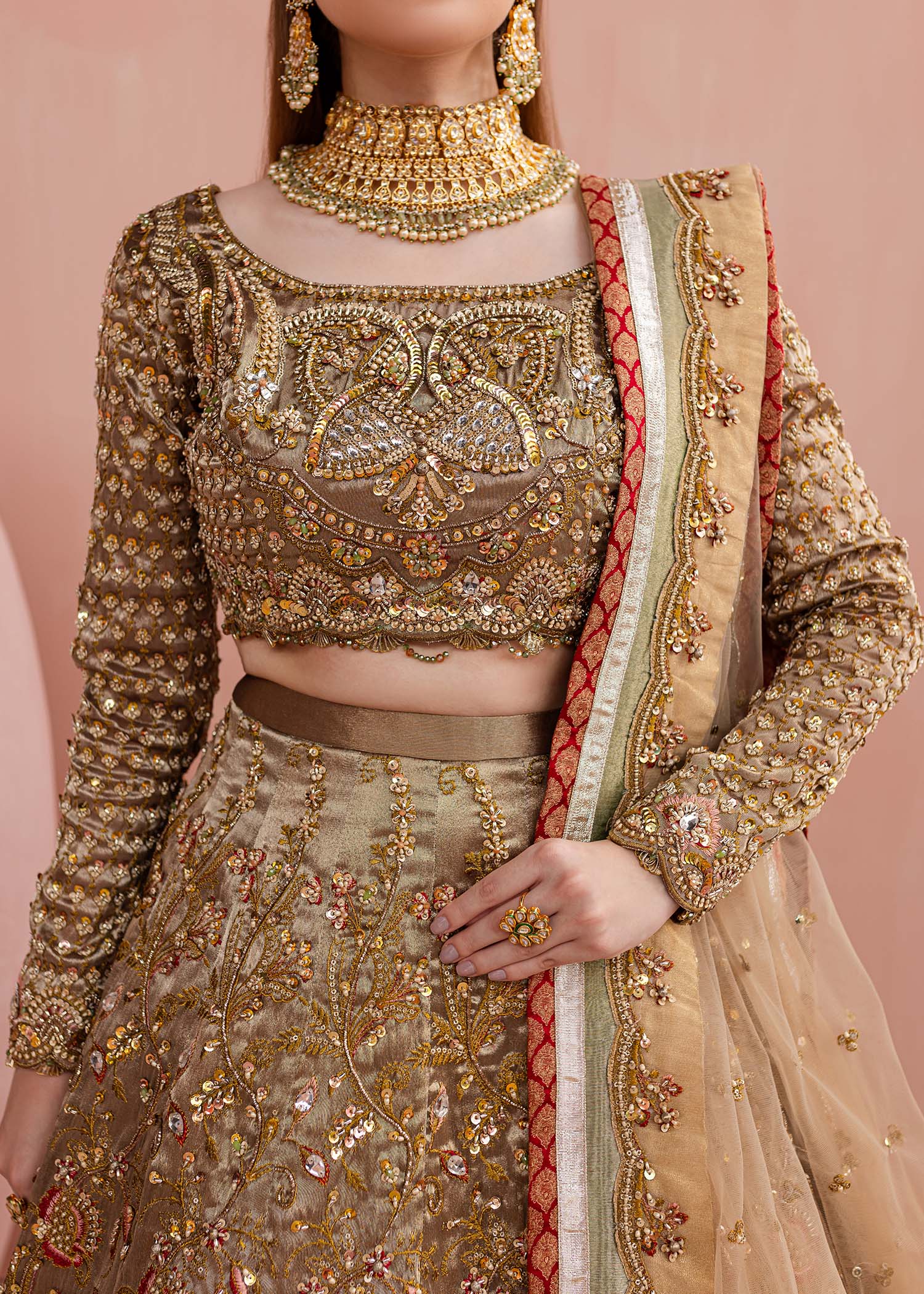 Our ÂÂNoraizÂÂ is enchanting and regal, made on luxe gold tissue. Her aura is further beautified with stunning tilla embroideries and hand-applied dubka, sitara, and crystal embellishments. Paired perfectly is a gorgeous gold net dupatta, and hints of green and red accents give this ensemble the couture feel you want to stand out.