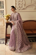 A perfect embodiment of celebration, €˜Sehrs a graceful ensemble, featuring the timeless charm of dusty mauve. This lavishly adorned Organza Jacket and airy drape dupatta with enchanting screen print, is skillfully adorned with intricate hand embellishments work, pairied with a Crushed Sharara, adding a touch of traditional work.