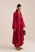 Ruby red straight jacquard lawn shirt with V-neckline and hanging threaded tassels. Appliqué-style embroidery in bold contrasting tones with geometric patchwork on hem and corners. Sleeves end in organza panels with lace and boring detail.