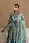 An aquamarine organza paneled angharaka peplum with crew keyhole neckline, tassel detail, gold and beige lace, fitted sleeves, cutwork, and sequin-edged floral screen print.