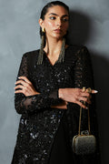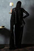 BLACK, FULL DRAPE DRESS WITH ASYMMETRICAL FULLY EMBELLISHED JACKET,