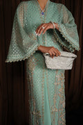 THE KAFTAN HAS A GEOMETRICAL SEQUIN PATTERN ON NET FABRIC WHICH IS ENHANCED BY CONTRASTING EMBELLISHMENT. IT FEATURES KIMONO SLEEVES AND EMBELLISHED LACE DETAIL ON THE FRONT WITH A HOOKED OPENING. LACE DETAILS ON THE EDGES WITH ORGANZA FABRIC DETAILS. THE OUTFIT COMES WITH A FLOOR LENGTH SLIP OF THE SAME COLOUR.