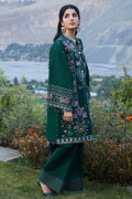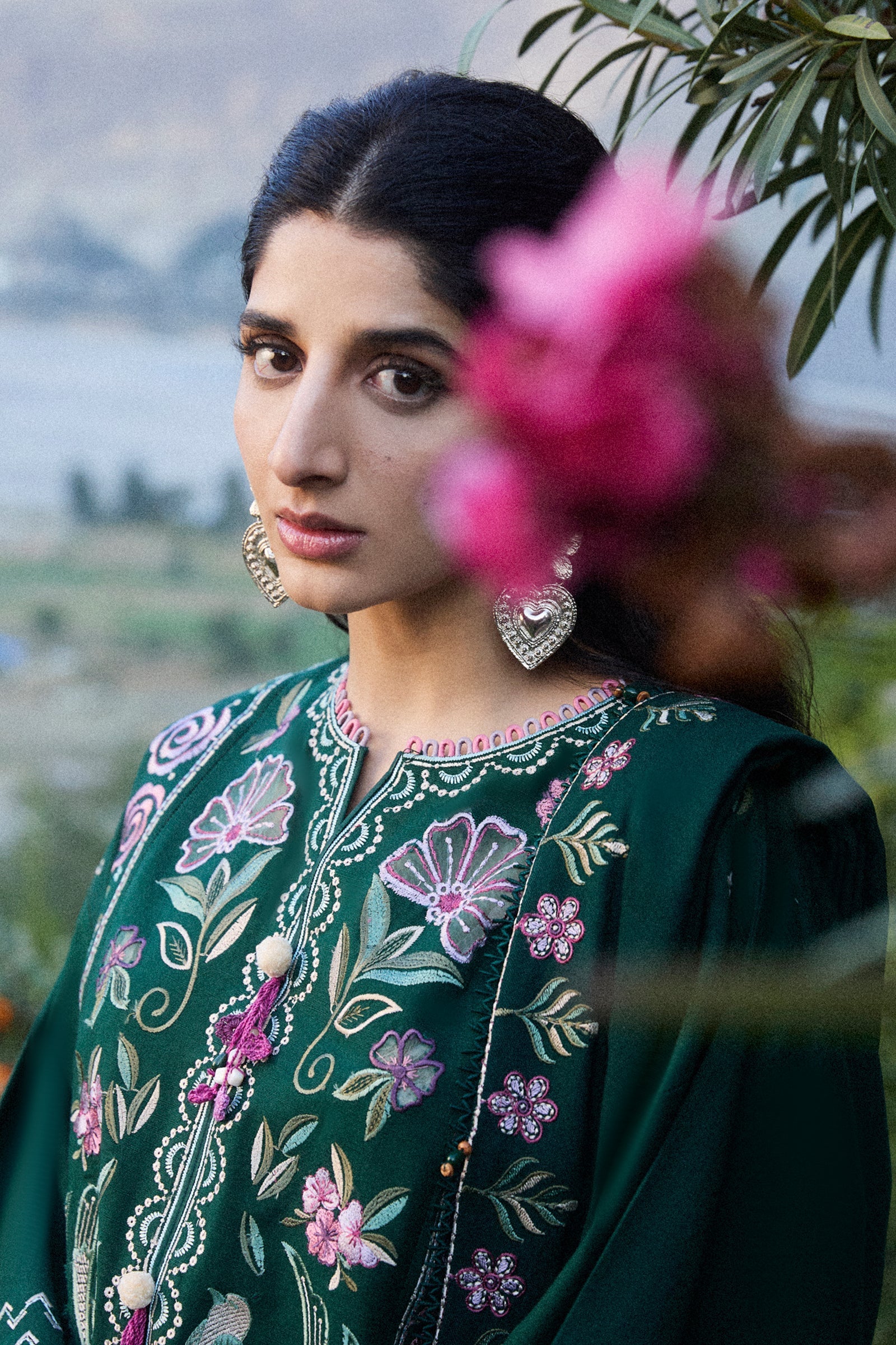 Arsin unfolds like a deep green jewel, its rich, luxurious hue serving as a canvas for artful elegance. Luminous ornamental and floral embroideries in delicate shades of lilac, berry, and sage bloom across the fabric, creating a tapestry of intricate beauty that enchants with every glance. This regal ensemble, crafted in warm, sumptuous khaddar, exudes an inviting depth, while the finely detailed laser-cut accents lend an artisanal flair. Accompanied by an exquisitely illustrated shawl and paired with tonal trousers, Arsin embodies the essence of the modern Zaha woman confident, poised, and unafraid to stand out. Striking florals blend timeless ethnic charm with a contemporary edge, turning this ensemble into a wearable masterpiece that celebrates the elegance of a woman who commands attention with effortless grace.