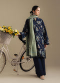 A rich midnight blue khaddar shirt and trouser offset with a soft sage green shawl, a balance of depth and calm for the season.