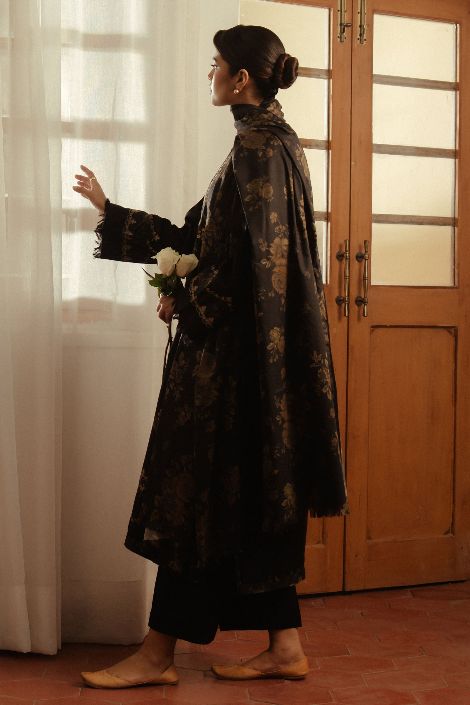 A jet black long kameez with embroidery all over is paired here with wide hem pants and a floral printed shawl.